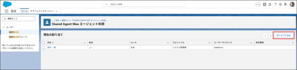 Shared Agent Meeの各機能の利用にあたり、権限セットを利用ユーザーへ割り当てを行います。 本ページでは、必要な権限セットの割り当て手順を説明します。