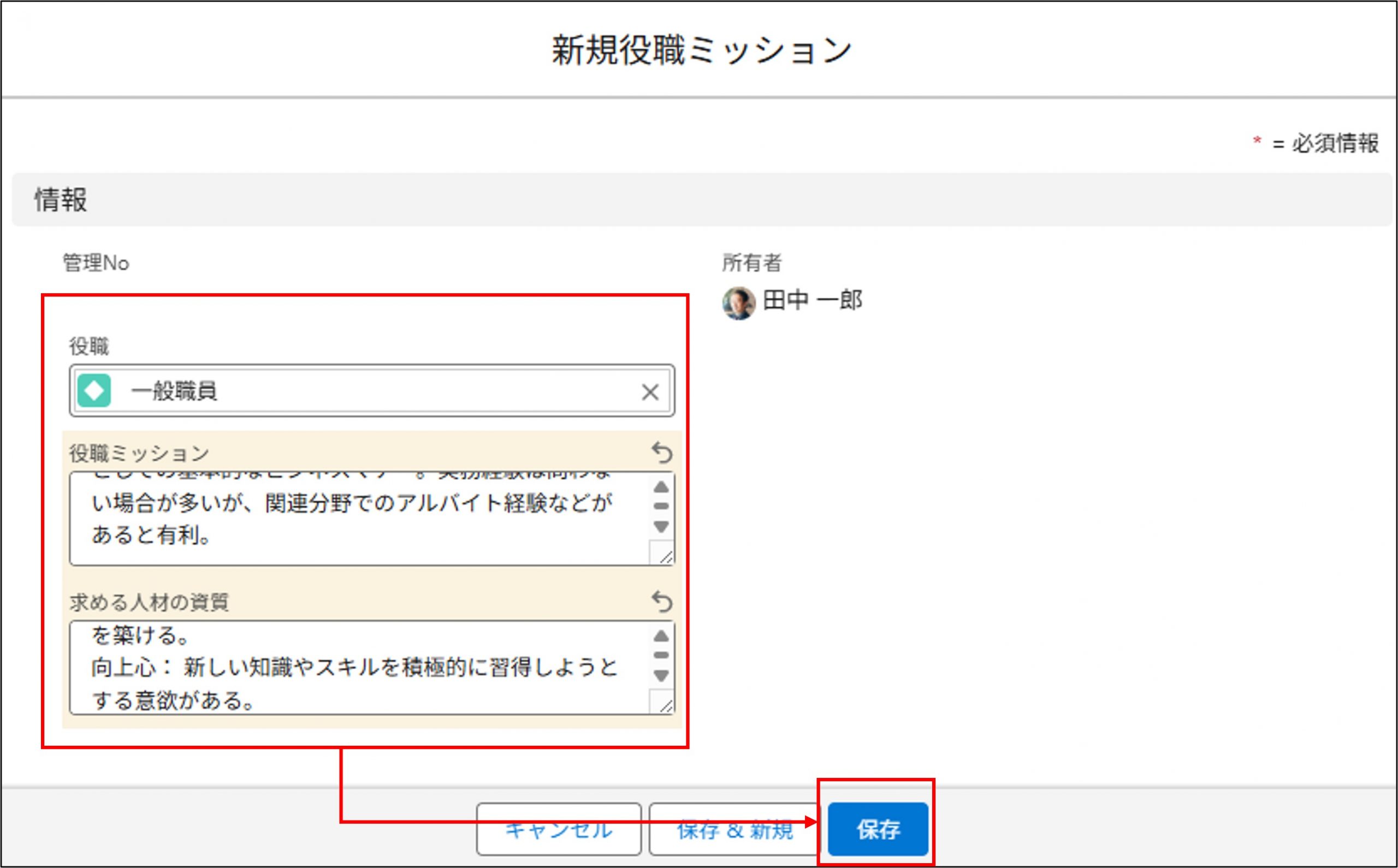 ③新規役職ミッションの作成画面にて、役職ミッションと求める人材の資質を入力して「保存」をクリックします。