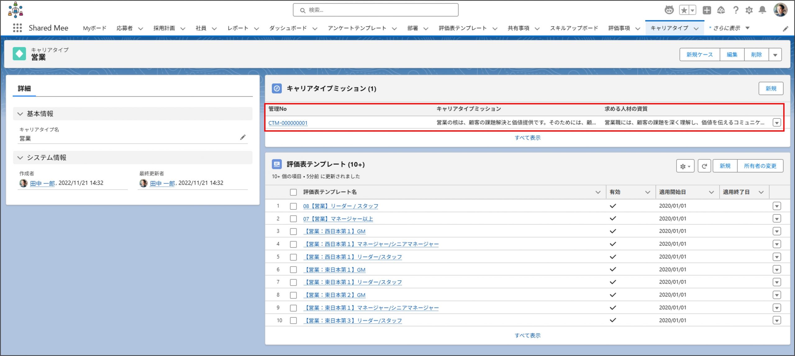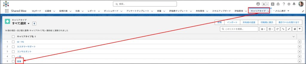 ①Shared Meeの「キャリアタイプ」タブをクリックして、キャリアタイプミッションを登録するキャリアタイプ名をクリックします。