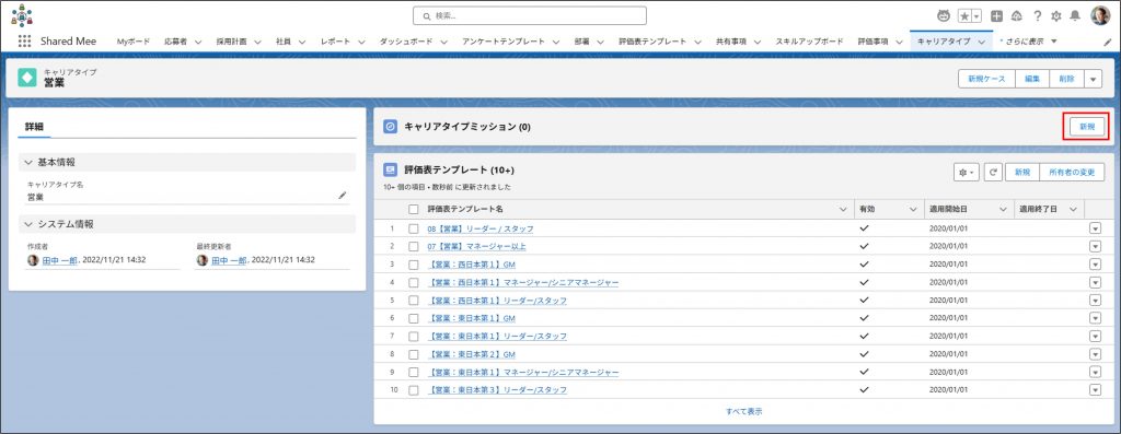 ②キャリアタイプ画面の右側にあるキャリアタイプミッションの「新規」をクリックします。