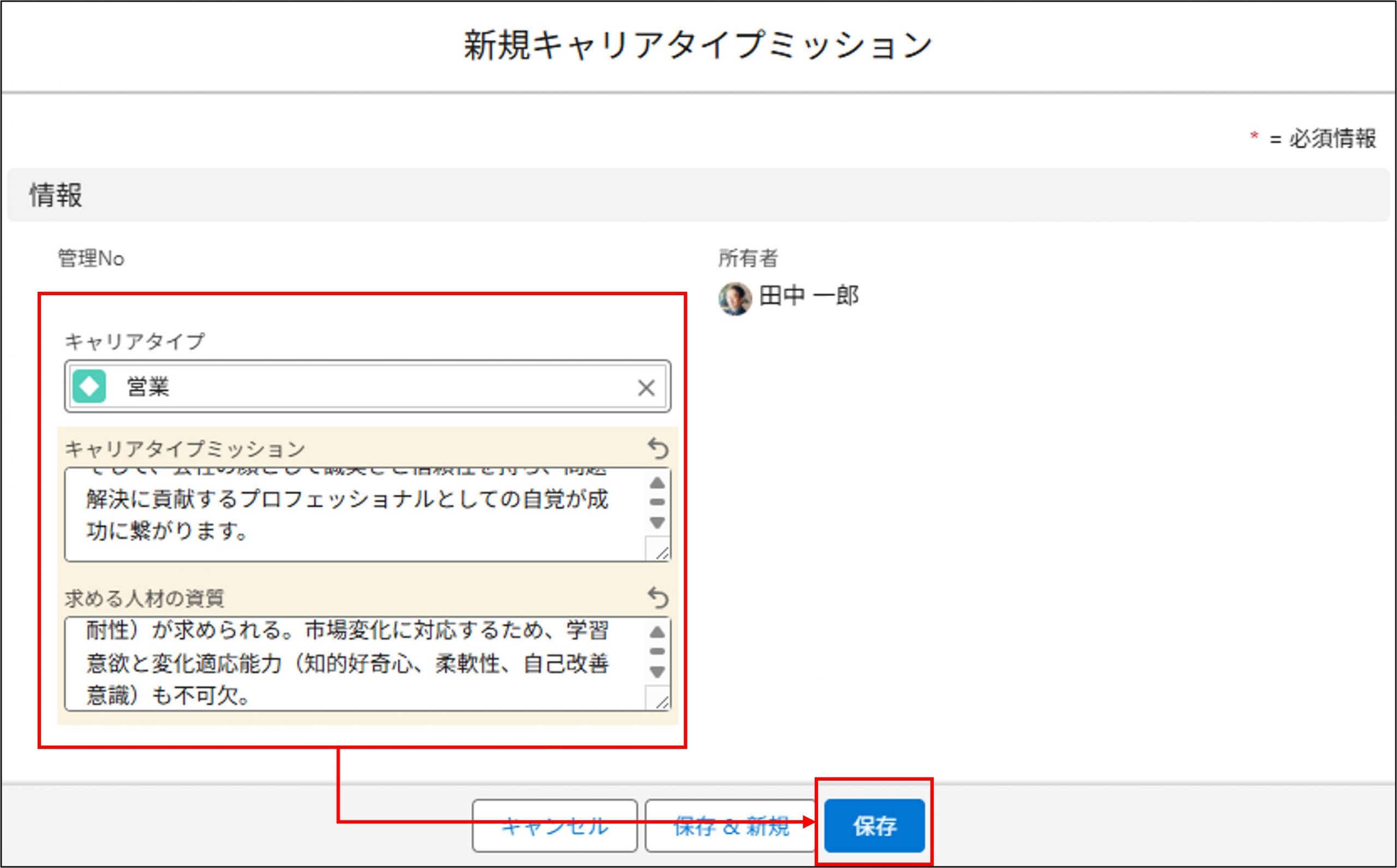 ③新規キャリアタイプミッションの作成画面にて、キャリアタイプミッションと求める人材の資質を入力して「保存」をクリックします。
